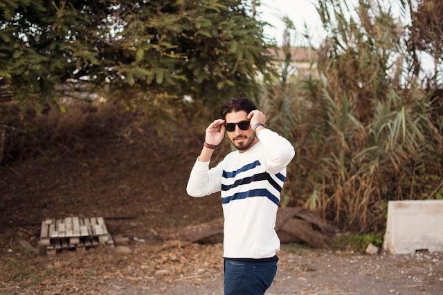 For this kind of looks formal but casual, I like the combination of jacket and basic t-shirt. So, for this occasion I wore a black jacket with a white t-shirt and in order to continue the same range of colors I chose a pair of grey trousers. Also, to finalize the look I wore all the complements in black, a sporty shoes, the sunglasses, the neoprene watch and a studded bracelet. As you can see this is a very basic outfit but which can fit very well for many different occasions.